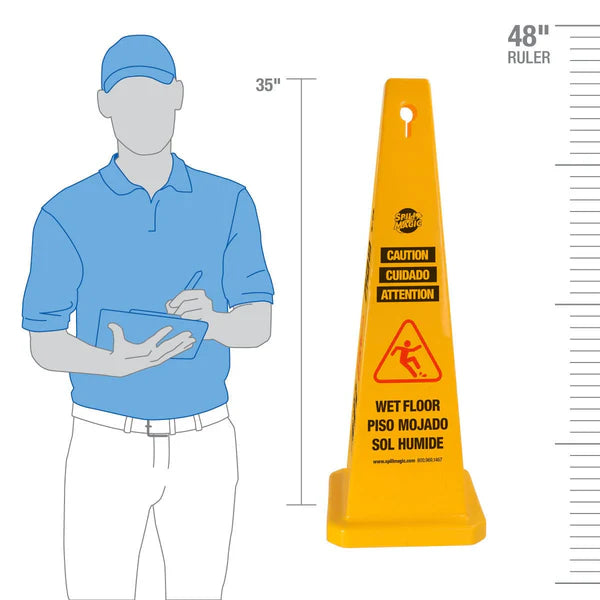 Spill Magic 97528 Trilingual Wet Floor Caution Cone, 35" Yellow with Wide Base for High Visibility Spill Alerts in Facilities