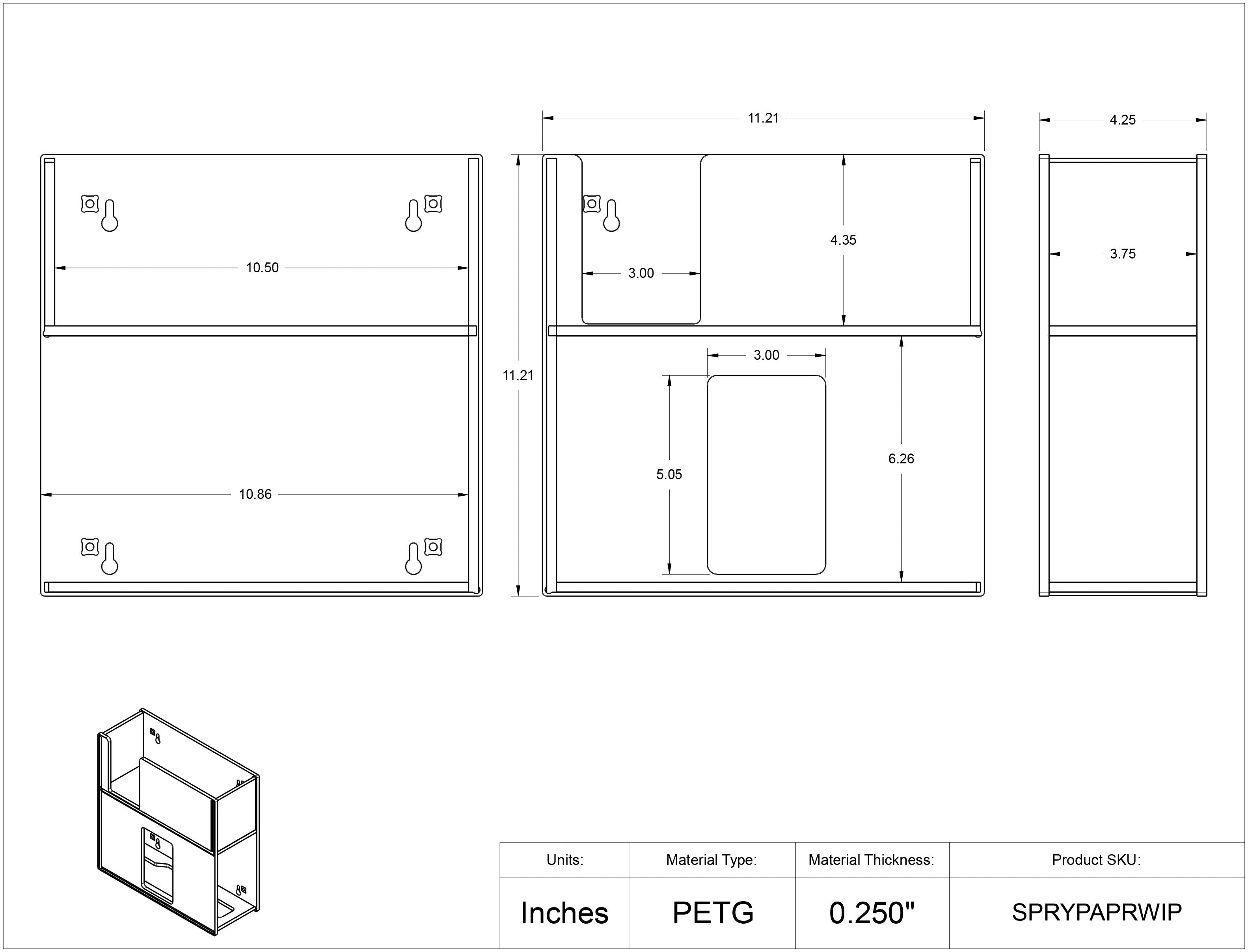 Holds spray bottles, wipe cannister and trifold paper towels. Fits up to 4.25in diameter wipe cannister. Paper towel stack inserts from the side and dispenses from the front, or underneath. Durable and cleanable PETG construction.