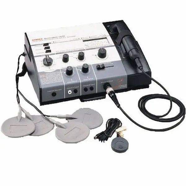 Amrex’s US54 SynchroSonic US/54 Combo Unit integrates therapeutic ultrasound with dual-channel low-volt AC stimulation in a compact, portable design for versatile electrotherapy in physical therapy, sports medicine, and pain management clinics. The ultrasound delivers up to 20 watts of variable or continuous power for deep tissue heating and non-thermal effects, while the stimulator provides ramped surge modes with adjustable duration and frequency (1-80 pps) for muscle re-education, edema reduction, and spasm control. With 2-pad capacity per channel for targeted application, it's ideal for treating acute/chronic conditions like tendonitis, strains, and joint pain. User-friendly controls ensure quick setup; made in the USA with durable construction for daily clinical use and a 3-year warranty.