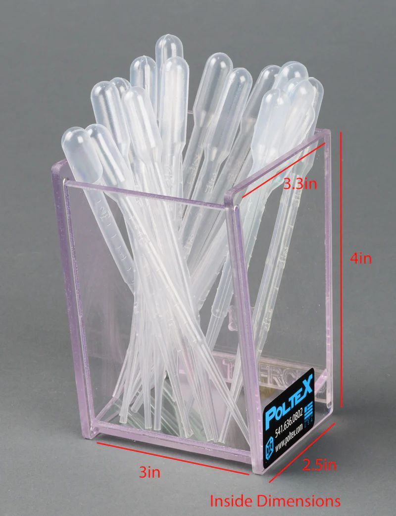 - Securely holds transfer pipettes or similar small items upright and out of the way