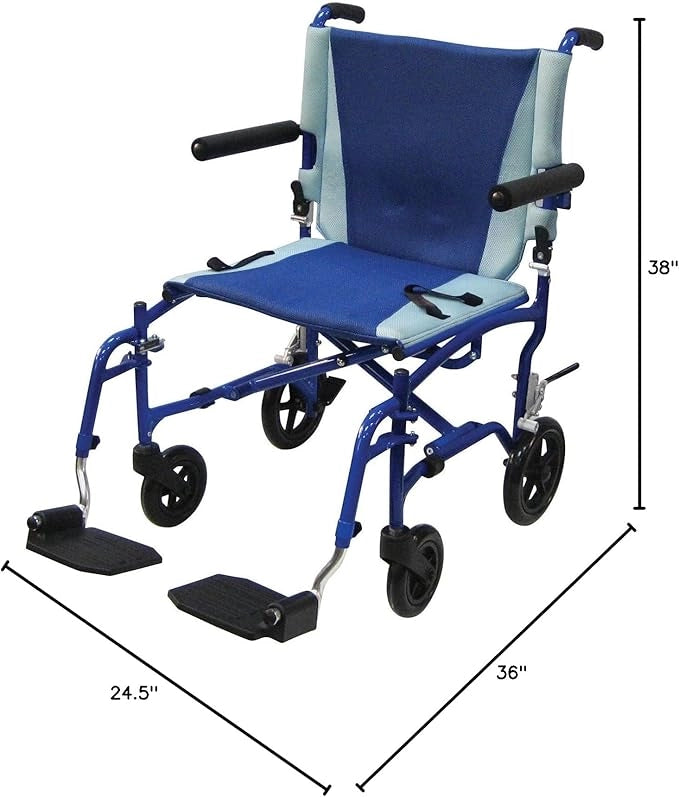 The Drive Medical TS19 Transport Chair is a lightweight aluminum model weighing only 14.5 lbs, perfect for easy portability and everyday use. Featuring a blue frame and matching blue upholstery for a stylish look, it includes frame magnets to secure footrests during carrying, removable padded flip-back arms, a two-way back release for folding forward, tool-free height-adjustable swing-away footrests, and aluminum rear wheel locks for reliable performance indoors and outdoors.