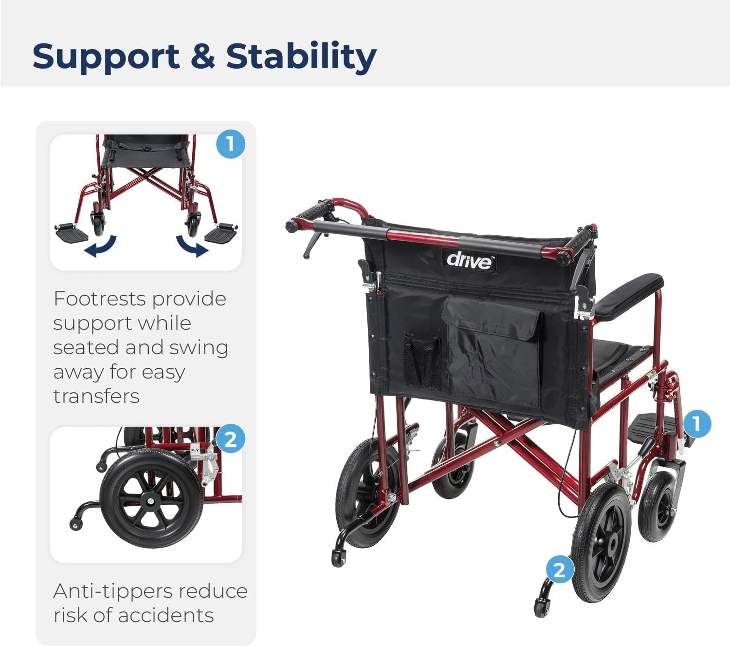 - Swing-away footrests with adjustable height for customized support