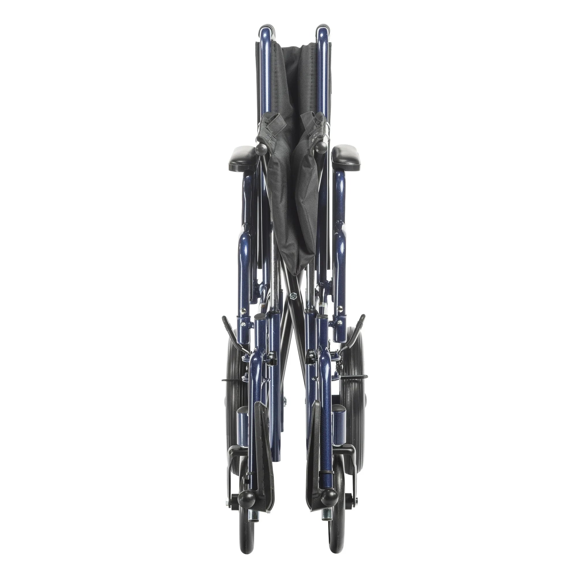 The Drive Medical 10952A Bariatric Transport Wheelchair features a reinforced steel frame with dual cross braces for exceptional durability and support, ideal for users up to 450 lbs. The sleek blue frame pairs with black heavy-duty nylon upholstery for a stylish, easy-to-clean design with a convenient back carry pouch. Equipped with removable reversible desk-length arms, adjustable leg supports, swing-away footrests, and 12" flat-free rear wheels, it ensures smooth mobility indoors and outdoors while folding compactly for storage.