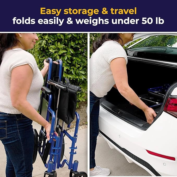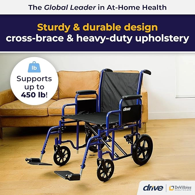 The Drive Medical 10952D Bariatric Transport Wheelchair features a reinforced steel frame with dual cross braces for exceptional durability and support, ideal for users up to 450 lbs. The sleek blue frame pairs with black heavy-duty nylon upholstery for a stylish, easy-to-clean design with a convenient back carry pouch. Equipped with removable reversible desk-length arms, adjustable leg supports, swing-away footrests, and 12" flat-free rear wheels, it ensures smooth mobility indoors and outdoors while folding compactly for storage.