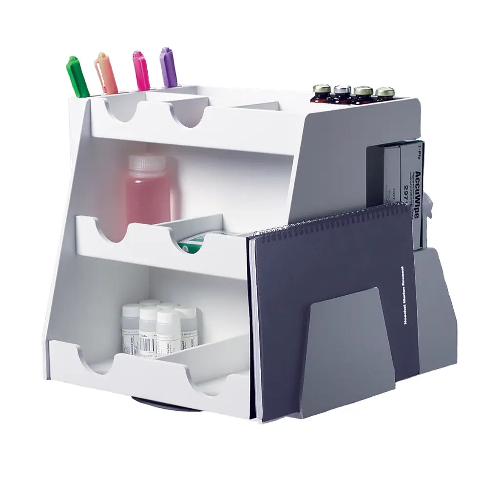 TrippNT’s Rotating Multi-Compartment Workstation keeps your lab or workspace organized and clutter-free. Featuring a smooth rotating base, it provides effortless access to supplies from every angle. With 3 shelves, 12 compartments, a 4-slot tool holder, and a book holder, it offers versatile storage for consumables and accessories. Constructed from lightweight, durable PVC, this workstation is designed for benchtop use, ensuring everything you need is always within reach. Ships fully assembled for immediate use.