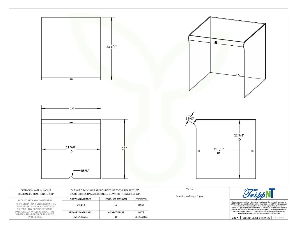 Protect delicate equipment from drafts with the TrippNT Extra Large Draft Shield. Designed with an overhang panel, it blocks downward airflow while a semi-circle cutout at the back allows cords and wires to pass through easily. Constructed from clear 3/16" acrylic, this shield is durable, easy to disinfect, and ideal for laboratories or workspaces where equipment protection is critical. Available in four size variants.