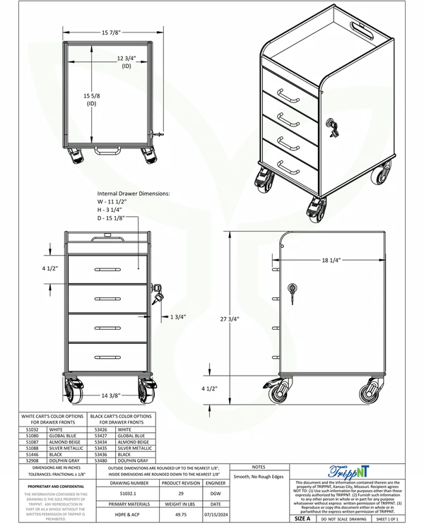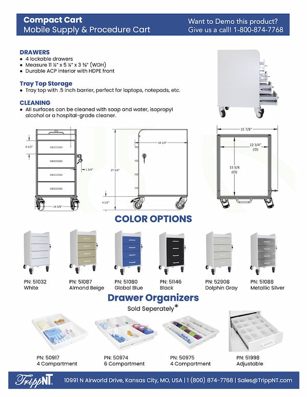 The TrippNT White Compact Cart with 4 drawers is designed for healthcare professionals who need reliable, space-saving storage. Built from durable, corrosion-resistant HDPE, ABS, and PETG materials, this compact cart is ideal for tight spaces, offering mobility, convenience, and lasting performance. Its total-locking drawers and recessed top tray ensure secure storage and easy access to essential supplies. Ships fully assembled for immediate use.