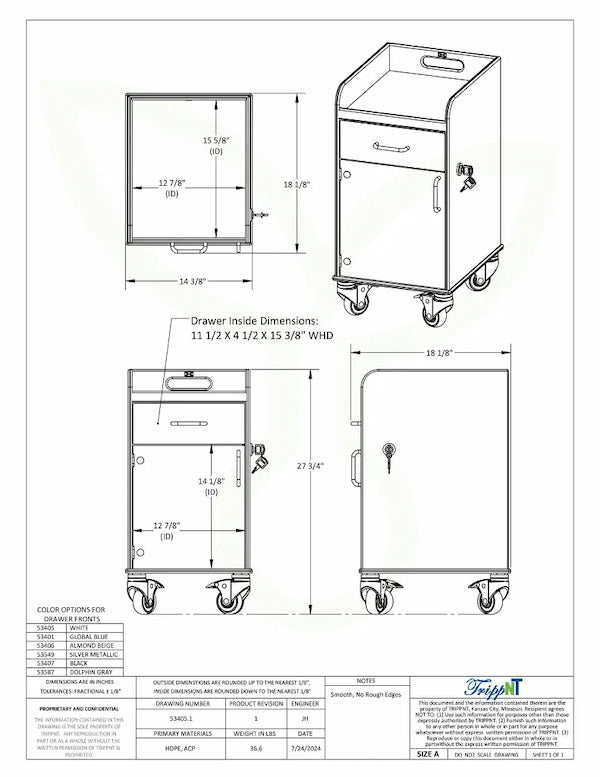 TrippNT's Bedside Cart is designed to securely protect and store patient’s belongings. The recessed top tray keeps essential items like phones, drinks, and personal items within reach. A bulk storage compartment and locking drawer provide safe storage for valuables such as backpacks, laptops, coats, and other personal effects. With smooth-rolling casters, including two locking wheels, the cart offers both mobility and stationary stability. Available in multiple color options, ships fully assembled, and backed by TrippNT’s 100% Total Replacement Lifetime Guarantee. Proudly made in the USA.