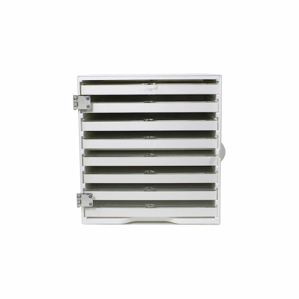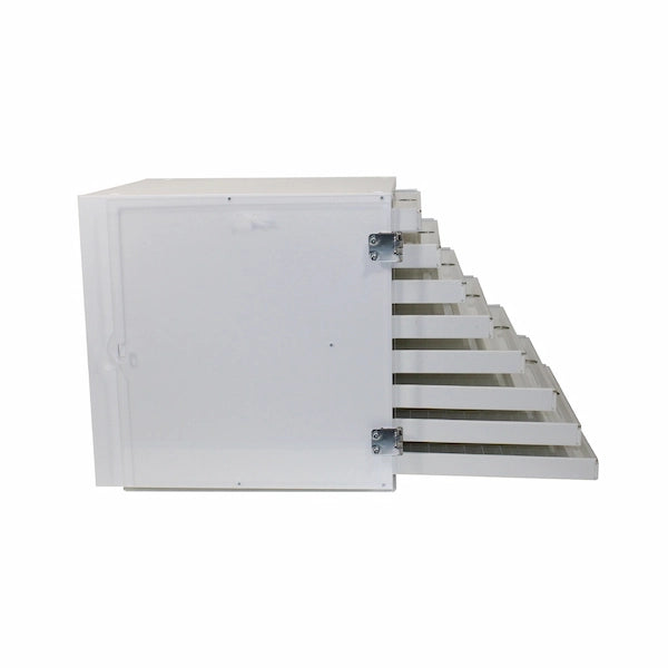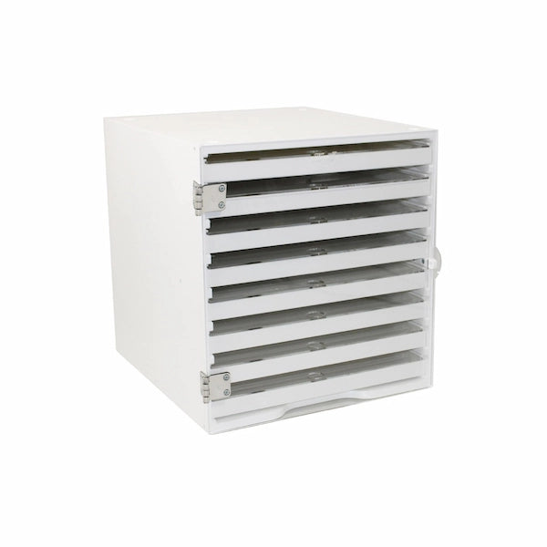 TrippNT's HPLC Mega 120 Column Cabinet offers secure storage for up to 120 columns with eight removable trays and adjustable dividers. Made from durable white HDPE with clear acrylic lids, this stackable cabinet provides easy inventory visibility. The clear acrylic lids slide forward and backward for convenient access. Designed for customizable storage, it can be wall-mounted using included keyholes and mounting hardware or stacked up to three for expanded storage. With a hasp lock for security, this cabinet is perfect for organizing HPLC columns in labs. Dimensions: 15 7/8 x 16 1/2 x 17 3/8 inches WHD.