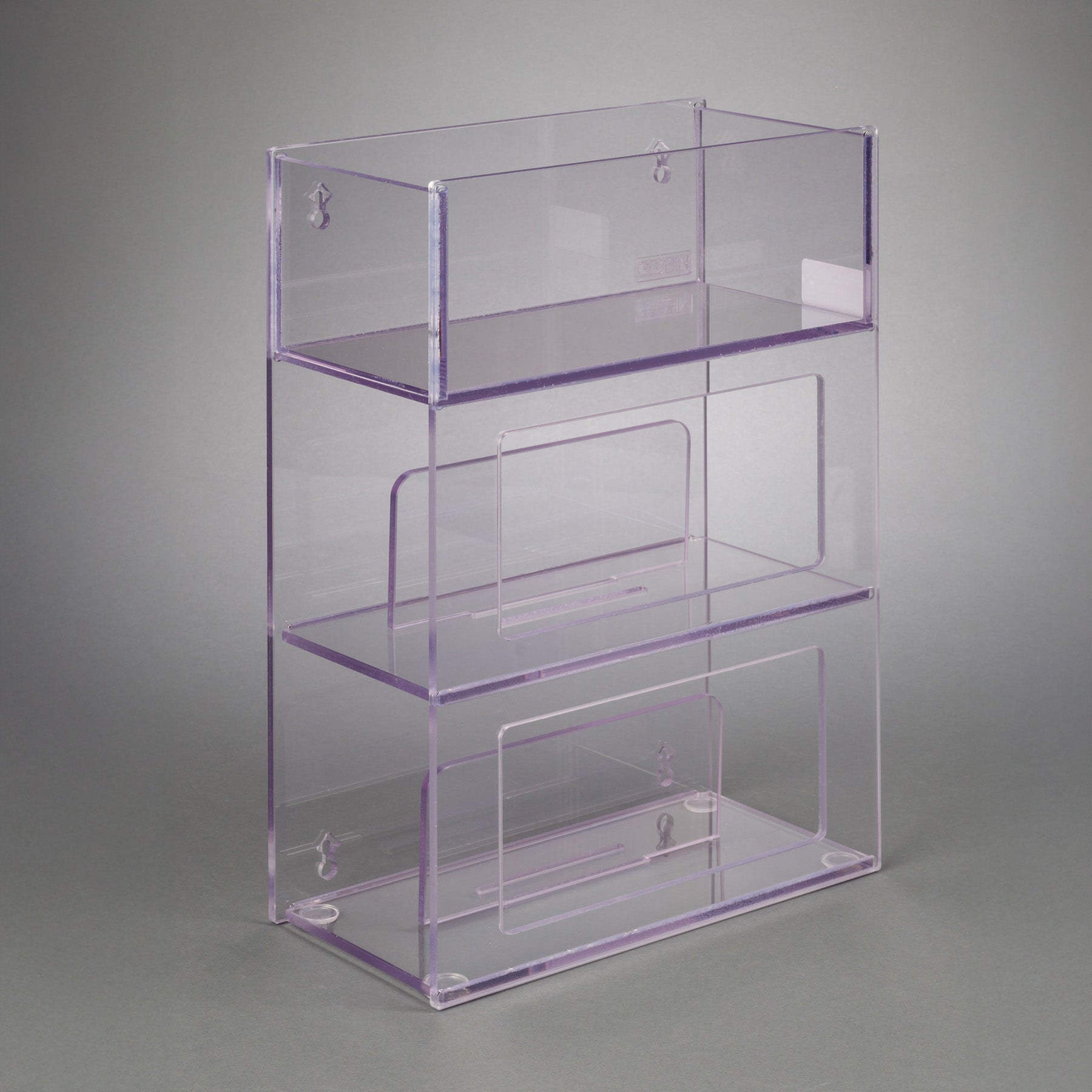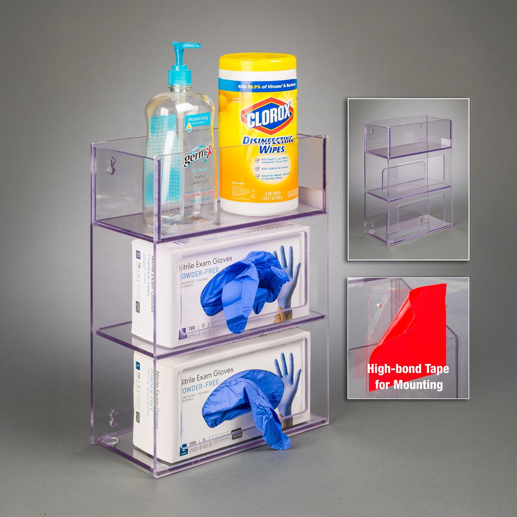 Two Glove Box Holder w/Bin holds two boxes of gloves plus wipe tub, spray cleaner, hand sanitizer, etc. Durable PETG construction. See image for dimensions. CONSUMABLES NOT INCLUDED. Mounting methods available: Wall Mount/Countertop, Tape and Magnet. All options come with Rubber bumpons on base for non-slip placement on countertop. Made in the USA.
