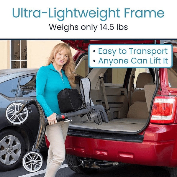 Introducing the Vive Carbon Fiber Rollator: a lightweight yet robust mobility solution designed with an innovative carbon fiber frame, weighing just 14.5 pounds. This rollator offers exceptional strength and effortless portability, outperforming aluminum models. It provides ample storage space, smooth maneuverability on various surfaces, and customizable comfort with adjustable features, ensuring a versatile and comfortable aid for your mobility needs.