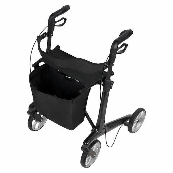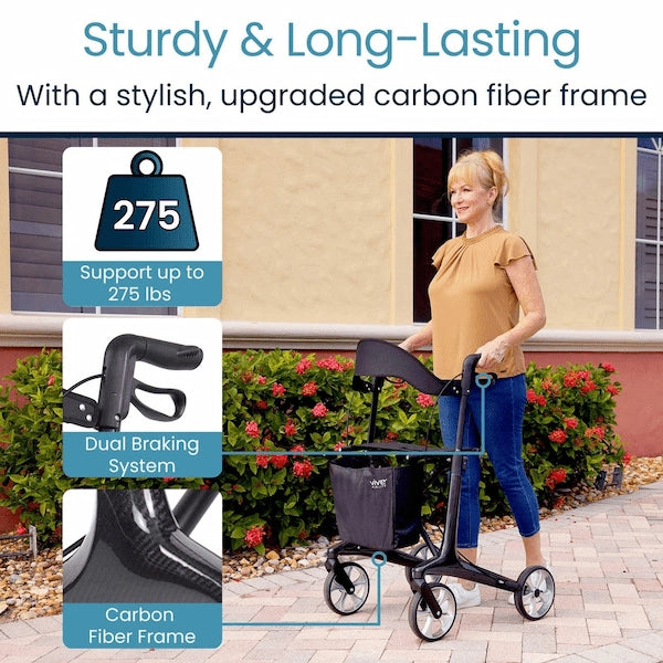 The Vive Core Carbon Fiber Rollator combines lightweight design with reliable support, weighing just 12.5 pounds yet capable of supporting up to 275 pounds. Designed for elderly individuals or those recovering from surgery or injury, this rollator is easy to maneuver with sturdy wheels and a durable frame. Its sleek carbon fiber construction delivers a stylish and portable solution that is strong enough for both indoor and outdoor use. The foldable design makes it compact and travel-friendly, easily fitting into cars or planes for convenient transport and storage. Height-adjustable handles and a locking brake system provide customized safety and control. For added comfort, the rollator features a padded seat with back support and a removable storage bag to keep essentials close by.