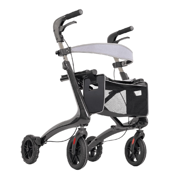 Experience lightweight strength and advanced mobility with this carbon fiber rollator, weighing just 15 lbs yet supporting up to 300 lbs. Its ergonomic reversed handles promote better posture and reduce wrist strain by allowing users to push with their palms, making it easier to navigate tight corners and busy spaces. Semi-all-terrain wheels, including heavy-duty rear tires and 8” pivoting front wheels, ensure smooth, stable movement across a variety of surfaces like pavement and gravel. Designed for personalized comfort, the rollator features height-adjustable handles and a height-adjustable backrest for optimal support. The extra-wide padded seat offers a comfortable place to rest, while easy-lock hand brakes provide added safety. A roomy 16” x 8” x 10” storage bag keeps essentials close at hand, and the rollator arrives fully assembled for immediate use.