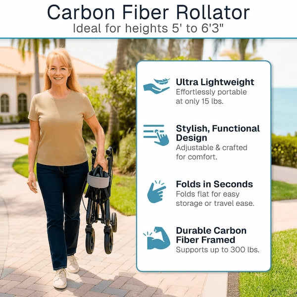 Constructed from premium carbon fiber, this ultra-light rollator weighs just 15 pounds, making it one of the lightest options available. Despite its minimal weight, it supports up to 300 pounds and delivers long-lasting strength and stability for daily use.