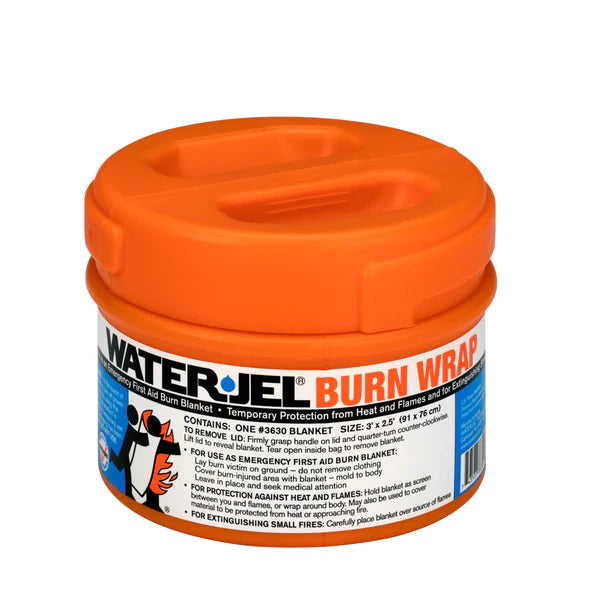 1 Water-Jel Heat Shield Blanket in Container, 36" Length x 30" Width. Is made of worsted wool. Capable of absorbing up to 13 times it own weight. The water-soluble gel extinguishes the flame, cools the burn and helps stop burn progression and pain. Stabilizes the patient and helps prepare for transport. Comes in a convenient orange canister. Protection against flames and heat. This Water-Jel Heat Shield Blanket is made of worsted wool, with an intercellular weave capable of absorbing up to 13 times it own weight. The biodegradable, bacteriostatic and water-soluble gel it is made with helps to extinguish the flame, cool the burn and help stop burn progression and pain. It stabilizes the patient and helps prepare for transport to a burn center or ER. Comes in a convenient orange canister.