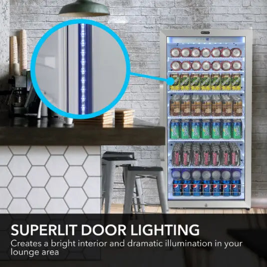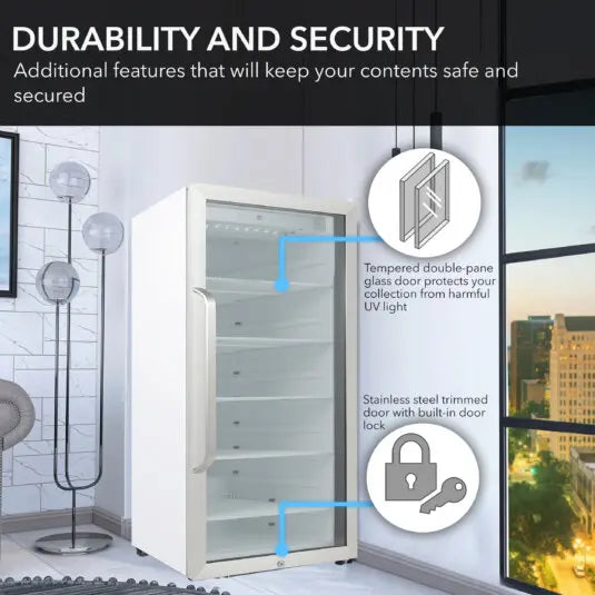 Our mini refrigerator with a glass door and LED lighting offers premium design and quality. The tempered double-glass door provides UV protection and allows you to easily monitor your beverage inventory. You can also adjust the soft interior LED lighting with a single button.