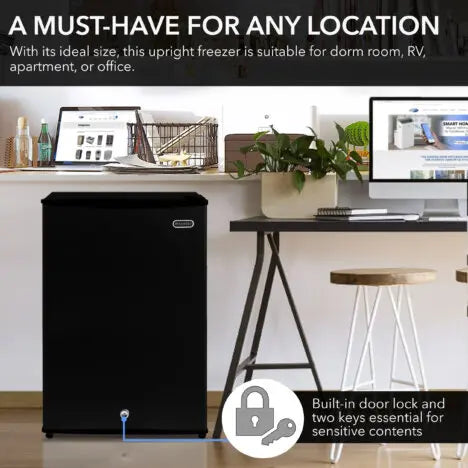 Ideal for any small space where cold storage is needed, the Whynter 3.0 cu. ft. upright freezer can also be used in the kitchen, offices, garages or basements. The Whynter 3.0 cu. ft. upright freezer features a black reversible-swing door, adjustable temperature control, and a lock for securing the contents.