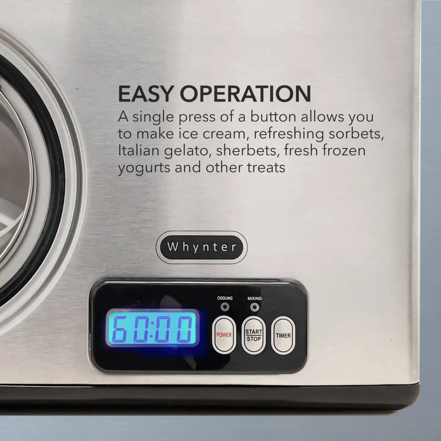 With the WHYNTER ICM-15LS stainless steel compressor-powered frozen dessert maker, you can create delicious desserts in about 30-40 minutes. This versatile, self-freezing ice cream maker not only lets you make top-notch ice cream, but also refreshing sorbets, Italian gelato, sorbets, fresh frozen yogurt, and other delicacies. This professional-grade ice cream maker offers top-notch features not found in affordable ice cream makers. The built-in powerful compressor freezer allows for continuous use without the hassle of pre-freezing the mixing bowl.