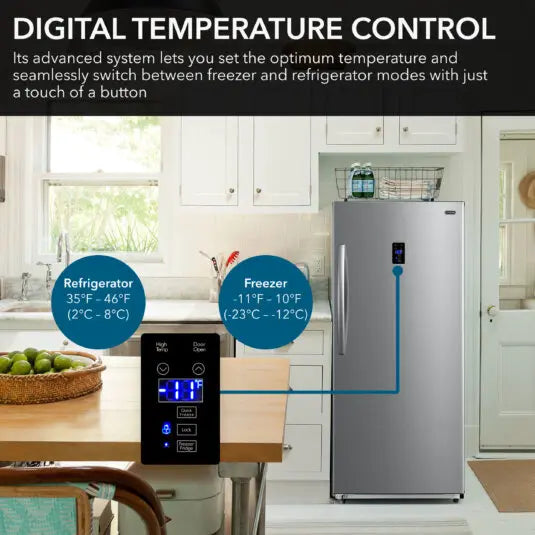 Perfect for your freezing and storing needs, the Whynter 13.8 ft³ Energy Star Digital Upright Convertible Freezer/Refrigerator offers the additional storage space you need with the features you want. Its efficient design and smart insulation make this 13.8 ft³ upright freezer an ENERGY STAR® certified appliance that helps you save on your energy bills. The powerful fan-circulating cooling system provides precise airflow for efficient temperature distribution, and the convenient frost-free design minimizes the need to manually defrost this upright freezer.