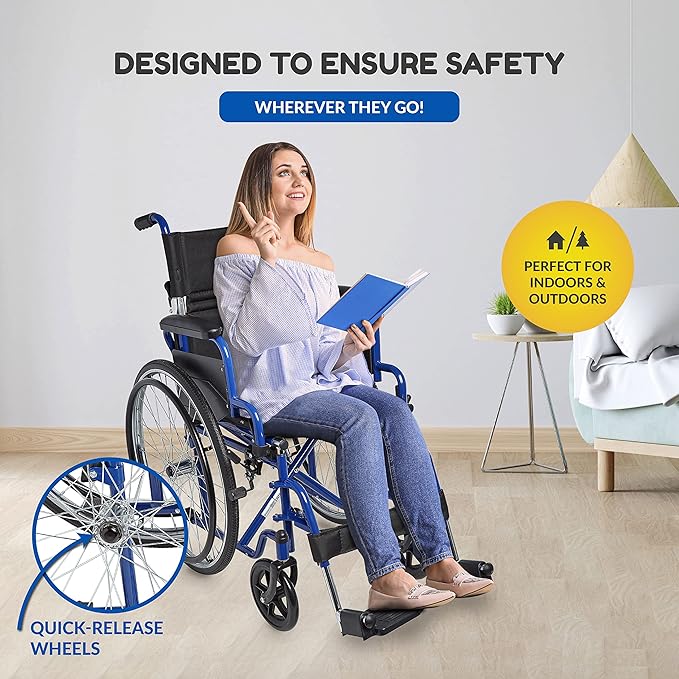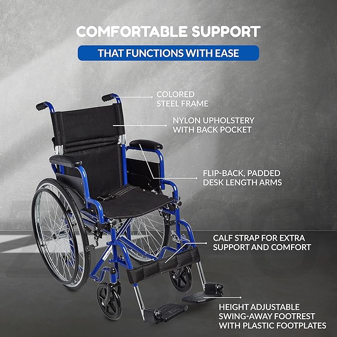 Ziggo ZG1600 Robust Adjustable Manual Wheelchair for Active Teens, Blue Frame with Quick-Release Wheels, 16" Seat for Enhanced Stability and Easy Folding